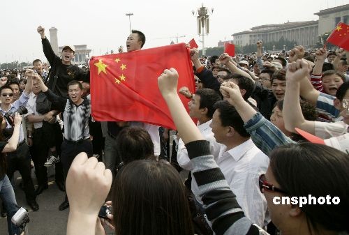 2008年5月19日14時(shí)31分,默哀結(jié)束后,在北京天安門廣場(chǎng)的近萬名民眾仍然聚集在一起,手持國旗和菊花,高喊:“加油四川!加油中國!”中新社發(fā) 李剛 攝