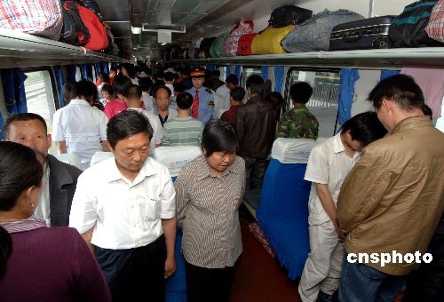 五月十九日十四時(shí)二十八分,福州開往青島四方的K68次列車上,乘客一齊起立為四川汶川大地震遇難同胞默哀。這趟列車按運(yùn)行時(shí)刻表剛好在此時(shí)發(fā)車,由于正值舉國(guó)默哀之際,特意推遲三分鐘發(fā)車。中新社發(fā) 王東明 攝