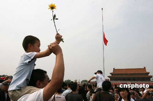 5月19日14時(shí)28分,數(shù)萬民眾在北京天安門廣場為四川汶川大地震遇難者默哀,一名兒童騎在父親肩頭高舉黃菊花表達(dá)哀思。5月19日至21日為中國全國哀悼日。中新社發(fā) 王瑤 攝