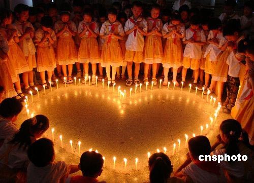 5月19日,小學(xué)生們點(diǎn)燃燭光,默默祈禱。當(dāng)日,河南許昌古槐街小學(xué)舉行“點(diǎn)燃紅燭、為災(zāi)區(qū)人民祈!被顒(dòng),學(xué)生們點(diǎn)燃燭光,默默為四川地震災(zāi)區(qū)人民祈禱祝福。中新社發(fā) 牛書培 攝