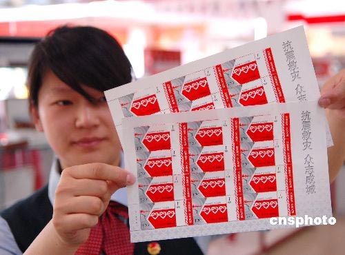 2008年5月20日,濟南市郵政局趵突泉郵電支局員工展示《抗震救災(zāi) 眾志成城》賑災(zāi)郵票。為進(jìn)一步向地震災(zāi)區(qū)提供社會援助,當(dāng)日,中國郵政特別發(fā)行《抗震救災(zāi) 眾志成城》賑災(zāi)附捐郵票一套一枚,售價2.20元,其中郵票面值1.20元,附捐金額1元。該套郵票采用主、附票形式,畫面表現(xiàn)了全國各族人民在嚴(yán)重的地震災(zāi)害面前手拉手、心連心,眾志成城的堅定意志和無私奉獻(xiàn)精神。據(jù)了解,為了表達(dá)全體郵政員工對地震災(zāi)區(qū)人民的情誼,中國郵政集團公司決定將此套郵票的全部郵資收入1560萬元和附捐款1300萬元,共計2860萬元通過民政部門捐贈地震災(zāi)區(qū)。中新社發(fā) 崔鵬森 攝