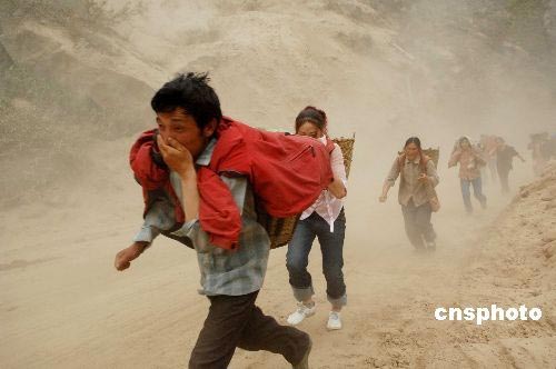 汶川重災(zāi)區(qū)仍然余震,崩塌、滑坡、泥石流等地質(zhì)災(zāi)害險情不斷,被困受災(zāi)群眾由搶險部隊協(xié)助安全撤離。圖為5月20日,汶川受災(zāi)群眾快速通過山體滑坡險段。中新社發(fā) 陳文 攝