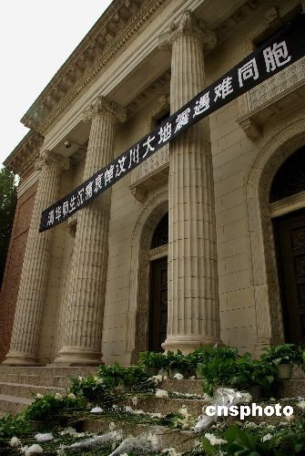 5月20日,清華大學(xué)大禮堂上方懸掛著黑底白字條幅:清華師生沉痛哀悼汶川大地震遇難同胞。全國(guó)哀悼日中,清華大學(xué)師生以各種方式表達(dá)對(duì)于遇難同胞的哀悼,以及對(duì)地震災(zāi)區(qū)同胞的關(guān)懷和支持。
