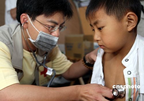 5月21日上午,臺(tái)灣紅十字醫(yī)療隊(duì)在四川省廣漢市高坪鎮(zhèn)災(zāi)民安置中心安營(yíng)扎寨開展醫(yī)療救治。醫(yī)療隊(duì)的外科醫(yī)生李俊秀先生(左)耐心地為10歲男童黃世文診病。黃世文是汶川地震重災(zāi)區(qū)什邡市龍居村的小學(xué)生,地震發(fā)生時(shí)被掩埋在教學(xué)樓三層的樓道內(nèi),經(jīng)過(guò)鄉(xiāng)親們?nèi)齻(gè)小時(shí)的營(yíng)救幸免于難;但是同班六十多個(gè)小朋友中死亡四十多人的悲慘事實(shí),令這個(gè)以前不知愁滋味的孩子變得心事重重,整日寡言少語(yǔ)。中新社發(fā) 任晨鳴 攝