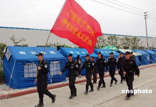 5月21日,支持四川地震重災(zāi)區(qū)的中國(guó)各地特警,主要任務(wù)從搶險(xiǎn)救人轉(zhuǎn)為維護(hù)災(zāi)區(qū)社會(huì)秩序,圖為廣西南寧公安局特警搶險(xiǎn)救災(zāi)突擊隊(duì)在重災(zāi)區(qū)都江堰市的受災(zāi)群眾安置點(diǎn)進(jìn)行巡邏。中新社發(fā) 劉萬強(qiáng) 攝