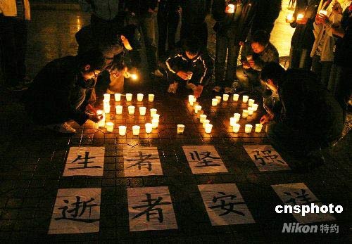 5月21日晚上,沈陽市下起了大雨,但大雨沒有擋住市民哀悼的心情,大家自發(fā)的來到沈陽市政府廣場(chǎng)用燭光等形式哀悼四川汶川地震遇難同胞并高呼“汶川加油,四川雄起,中國加油”等口號(hào)。中新社發(fā) 黃金昆 攝