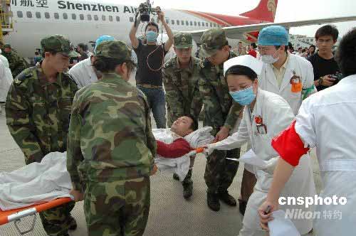 5月22日15時(shí)40分,深圳航空公司一架波音737飛機(jī)準(zhǔn)時(shí)將38名四川災(zāi)區(qū)傷員運(yùn)抵南寧國(guó)際機(jī)場(chǎng)。大批早已集結(jié)在此的醫(yī)護(hù)人員迅速將傷員轉(zhuǎn)運(yùn)至南寧各大醫(yī)院。當(dāng)天將有4架飛機(jī)共144名傷員運(yùn)至南寧,這些在地震中經(jīng)歷了生死瞬間的四川同胞,將分別被安排在廣西醫(yī)科大學(xué)第一附屬醫(yī)院等四個(gè)醫(yī)院進(jìn)行后續(xù)治療。中新社發(fā) 蔣雪林 攝