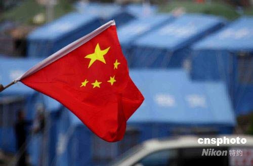 圖:飄揚(yáng)在映秀臨時(shí)救助地上空的五星紅旗