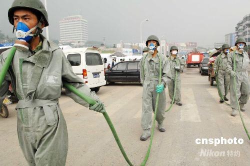5月23日,中國空軍某部官兵在地震災區(qū)綿竹漢旺街頭展開消毒防疫。中新社發(fā) 陳文 攝