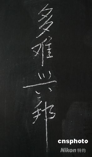 溫家寶總理5月23日在看望臨時(shí)安置在四川綿陽(yáng)長(zhǎng)虹培訓(xùn)中心北川中學(xué)高三同學(xué)時(shí),用粉筆在黑板上寫下的“多難興邦”四個(gè)大字。中新社發(fā) 蒲滔 攝
