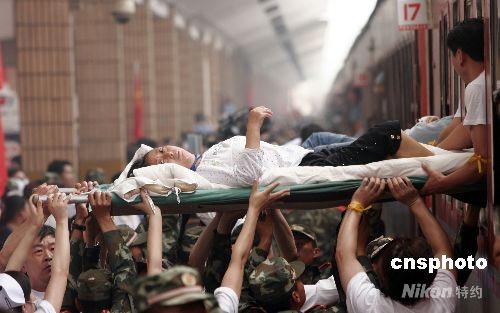 5月24日,運(yùn)載四川綿陽到武漢漢口的264名地震災(zāi)區(qū)傷員轉(zhuǎn)運(yùn)專列到達(dá)漢口站。他們將在協(xié)和、同濟(jì)、陸軍總醫(yī)院、人民醫(yī)院等醫(yī)院接受治療。中新社發(fā) 攝記 攝