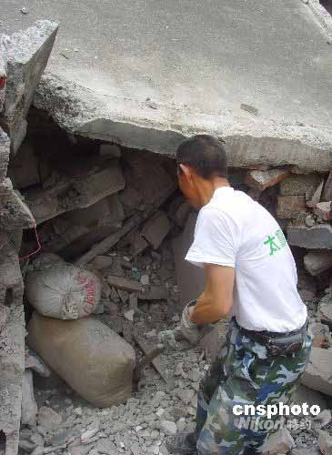 四川汶川大地震幾乎將安縣永安鎮(zhèn)躍進村夷為平地,地震后,當(dāng)?shù)卮迕穹e極展開生產(chǎn)自救,5月24日上午,村民付作興在自家房屋的廢墟中“搶救”糧食,希望以此減輕政府負擔(dān)。中新社發(fā) 霍潺 攝
