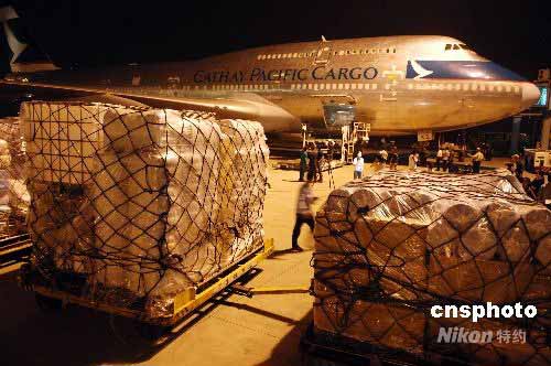 滿載各類救災(zāi)物資、從美國(guó)起飛的一架波音七四七貨運(yùn)專機(jī),于24日晚11時(shí)50分飛抵成都雙流國(guó)際機(jī)場(chǎng)。這架由美國(guó)著名慈善機(jī)構(gòu)撒瑪利亞救援會(huì)包租的專機(jī),是截至目前政府渠道之外運(yùn)送救災(zāi)物資到四川災(zāi)區(qū)的首架國(guó)外民間包機(jī)。中新社發(fā) 陳文 攝