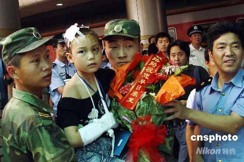 五月二十五日,一名來自四川廣元的小傷員被兩軍解放軍戰(zhàn)士抱起。當(dāng)日上午十一時零三分,滿載著二百七十二名汶川大地震受傷人員的廣元至鄭州“運(yùn)送災(zāi)區(qū)受傷親人”專列抵達(dá)鄭州火車站,他們將在當(dāng)?shù)鼐偶抑付ㄡt(yī)院接受治療。中新社發(fā) 李志全 攝