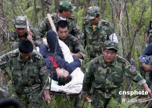 5月24日,駐豫某紅軍師、號(hào)稱“鐵軍”的葉挺獨(dú)立團(tuán)22名官兵渡岷江、翻大山,將大山深處的四川省汶川縣旋口鎮(zhèn)黃家村3名在地震中受傷骨折的村民或用簡(jiǎn)易擔(dān)架,或輪流背負(fù),歷經(jīng)9小時(shí)轉(zhuǎn)移到安全地區(qū),并及時(shí)送往都江堰醫(yī)治。中新社發(fā) 張曉理 攝
