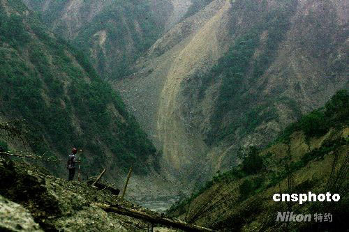 汶川大地震造成北川縣外3公里的一座大山崩塌,泥石堵塞河道形成危險的唐家山堰塞湖,直升飛機難以降落。一組科技人員5天前成功空降,在塌方中測得寶貴的資料緊急報告。中新社發(fā) 賈國榮 攝
