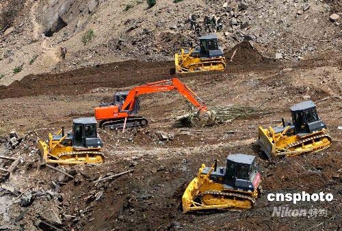 圖:大型機(jī)械在唐家山堰塞湖排險(xiǎn)