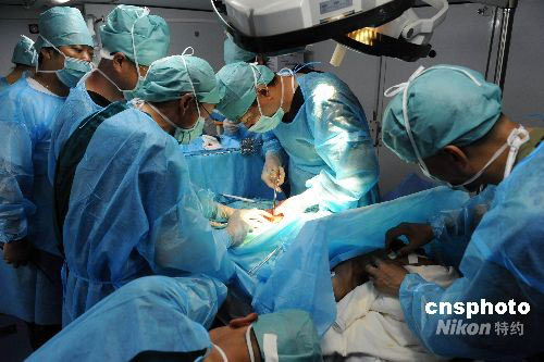 5月27日晚七點,四川都江堰市下起大雨造成市政停電。一名患者來到解放軍總醫(yī)院醫(yī)療隊就診,接診醫(yī)生初步診斷為急腹診,并立即在醫(yī)療隊野戰(zhàn)外科醫(yī)院野戰(zhàn)手術(shù)車內(nèi)利用自給電進行手術(shù)。經(jīng)開腹探查病人為結(jié)腸癌合并結(jié)腸穿孔,危及生命。經(jīng)過20余名專家通力合作,手術(shù)獲得成功。中新社發(fā) 孔令占 攝
