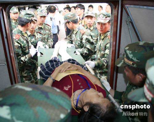 5月29日,徐州火車站,武警戰(zhàn)士小心地將傷員抬下火車。當(dāng)天,130名四川地震災(zāi)區(qū)傷病員乘坐“救28/7次”特殊專列順利抵達(dá)江蘇徐州。抵達(dá)后,他們迅速被安排到徐州市第一人民醫(yī)院、徐州醫(yī)學(xué)院附屬醫(yī)院等市區(qū)四家大醫(yī)院做進(jìn)一步治療。中新社發(fā) 蔡廣銀 攝