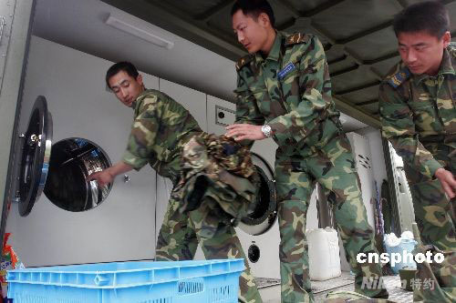 5月29日,工作人員在四川什邡市紅白鎮(zhèn)路邊的一輛流動(dòng)洗衣車上忙碌。近日,成都軍區(qū)聯(lián)勤部在各重災(zāi)區(qū)設(shè)置流動(dòng)洗衣車為救援官兵和受災(zāi)群眾免費(fèi)服務(wù),目前已經(jīng)有5臺(tái)野戰(zhàn)流動(dòng)洗衣車在重災(zāi)區(qū)投入使用。據(jù)介紹,每輛野戰(zhàn)流動(dòng)洗衣車每90分鐘可以洗滌、烘干約40公斤衣物。中新社發(fā) 張曉理 攝
