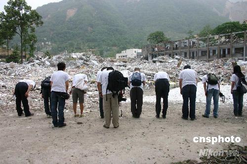 《中國(guó)新聞周刊》編輯記者在北川中學(xué)廢墟前默哀