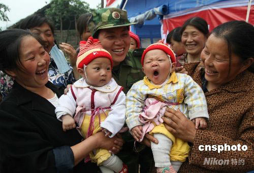 6月4日,在地震中受到傷害的平武縣石坎鄉(xiāng)五個月大的雙胞胎兄弟李杰、李彬,經(jīng)過濟南軍區(qū)第159醫(yī)院野戰(zhàn)醫(yī)療隊軍醫(yī)的精心呵護,恢復(fù)了健康。在受困群眾救助站,雙胞胎兄弟成為一對耀眼的“小明星”。中新社發(fā) 畢華明 攝