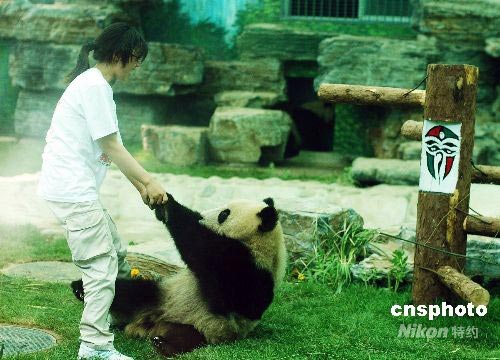 圖為在活動(dòng)場(chǎng)里憨態(tài)可掬的大熊貓與飼養(yǎng)員“拔河”。6月5日上午,8只四川大熊貓首次與游客在北京動(dòng)物園見(jiàn)面。他們憨態(tài)可掬十分惹人喜愛(ài),頑皮的動(dòng)作不時(shí)引得游客發(fā)出笑聲。這8只分別叫做翠翠、朵朵、美欣、鳳儀、淘淘、朗朗、歡歡、福娃的活波可愛(ài)的大熊貓分別住在面積為20多平方米的3間獸舍內(nèi),每間獸舍都安裝了空調(diào),室內(nèi)的溫度控制在大熊貓喜歡的25攝氏度左右,這使這些可愛(ài)的大熊貓感受到與四川臥龍家鄉(xiāng)一樣的環(huán)境。中新社發(fā) 筱瑋 攝