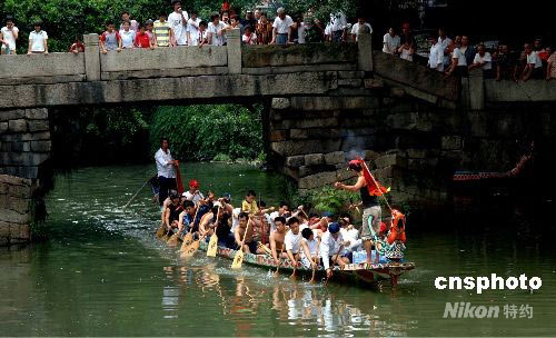 6月6日,福州臺江南公萬壽村村民按當(dāng)?shù)匕倌昝袼自诃h(huán)村內(nèi)河舉行端午龍舟競渡。據(jù)當(dāng)?shù)乩陷叴迕穹Q,自清朝道光年間開始,該村就有端午節(jié)龍舟競渡風(fēng)俗,沿襲至今。中新社發(fā) 劉可耕 攝
