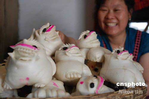 2008年6月7日,居民在趕蒸老虎饃喜迎端午佳節(jié)。過端午蒸老虎饃,敬奉懷念祖先,祈禱“平安、吉祥、和諧”是山西晉南運城一帶群眾敬奉古代詩人屈原和祖先流傳的傳統(tǒng)民間習俗和傳統(tǒng)面食藝術(shù)。中新社發(fā) 高新生 攝