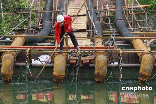 6月7日下午,四川省遂寧市明星自來水公司員工正在打撈渠河新增取水口的雜物,隨時準備在渠河深處取水。為了應對唐家山堰塞湖險情,處于下游的遂寧市及時多次組織群眾開展撤離疏散大演習,實際轉移群眾19186人,并在10小時之內(nèi)迅速開辟出第二水源。如果堰塞湖泄洪,遂寧市民唯一的自來水水源--涪江水質將造成污染。第二水源400萬方蓄積水源將可保證市城區(qū)生活用水60天以上。中新社發(fā) 鐘 敏 攝