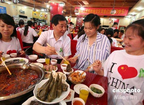 圖:地震傷員在重慶吃火鍋過(guò)端午