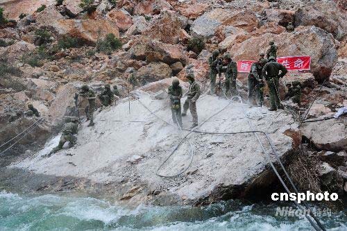 6月7日,經(jīng)過(guò)解放軍官兵和鐵路職工25個(gè)晝夜的連續(xù)奮戰(zhàn),寶成鐵路109隧道段嘉陵江堰塞湖被成功疏通,這標(biāo)志著預(yù)計(jì)在6月中旬疏通的109隧道和嘉陵江河道提前全部搶通。5月12日,四川汶川8級(jí)特大地震造成西安鐵路局管內(nèi)寶成線(xiàn)109隧道附近山體突然坍塌,連接西北和西南的交通大動(dòng)脈寶成鐵路中斷。約12萬(wàn)方巨石將隧道旁的嘉陵江河道完全堵塞,形成一條長(zhǎng)3.4公里、積水約100萬(wàn)立方米的堰塞湖,嚴(yán)重威脅到寶成鐵路和沿江人民群眾生命財(cái)產(chǎn)安全。目前,解放軍官兵和鐵路職工已清理出一條長(zhǎng)215米、寬25至50米、平均深度約5米的導(dǎo)流渠,基本達(dá)到迎夏度汛的要求。 中新社發(fā) 唐振江 攝
