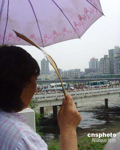 唐家山堰塞湖泄流進展順利,6月10日下午3點,上萬綿陽市民頂著酷暑,陸陸續(xù)續(xù)涌向處于較高位置的東方紅大橋及涪江兩岸河堤探望洪水水勢。中新社發(fā) 霍潺 攝