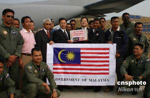 6月10日,馬來西亞政府捐贈四川地震災(zāi)區(qū)的首批救援物資,由兩架軍用專機(jī)運(yùn)抵成都。四川省方面與馬來西亞方面在機(jī)場停機(jī)坪進(jìn)行了簡短的物資交接。中新社發(fā) 黃永莉 攝