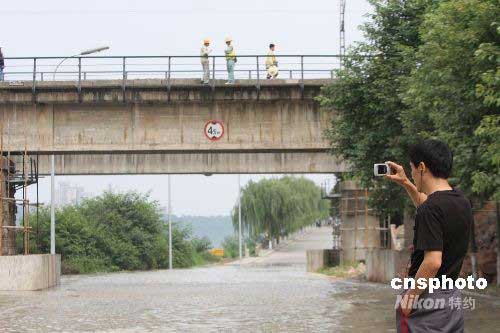 6月10日,唐家山堰塞湖泄洪流量迅速加大,泄流量曾超過6000立方米/秒,堰塞湖下游立即采取了應(yīng)對措施。圖為唐家山堰塞湖洪水安全通過寶成鐵路涪江大橋。中新社發(fā) 黃榮 攝