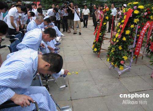 6月11日,在湘雅三醫(yī)院接受救治的四川大地震首批康復(fù)傷員來到韶山,向毛澤東銅像敬獻(xiàn)花籃,深情鞠躬。明天他們就將返回四川,開始重建家園。中新社發(fā) 劉雙雙 攝