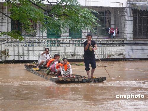 6月11日至13日凌晨,永?h普降特大暴雨,降雨量高達(dá)346.3毫米,縣城東河和西河的洪水水勢(shì)兇猛,西河水最高達(dá)到143.45米,超過(guò)警戒水位5.45米。截止到13日10時(shí)許,永福全縣被洪水圍困民眾4900人,緊急轉(zhuǎn)移安置民眾4600多人。圖為救援人員正奮力轉(zhuǎn)移被洪水圍困的民眾。中新社發(fā) 周利朔 攝
