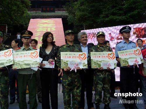 6月14日上午,在世界文化遺產(chǎn)青城山—都江堰景區(qū)伏龍觀廣場(chǎng),“關(guān)愛(ài)都江堰 感恩全社會(huì)”活動(dòng)在風(fēng)雨中正式啟動(dòng),以表達(dá)都江堰市63萬(wàn)人民對(duì)全國(guó)人民的深深感恩之情。啟動(dòng)儀式上,凝聚著都江堰市民深情厚誼的第一批“大愛(ài)無(wú)疆,感恩永恒”感恩卡,由與會(huì)領(lǐng)導(dǎo)贈(zèng)送給參與都江堰“5.12”大地震救援工作的解放軍戰(zhàn)士、武警官兵、公安干警、醫(yī)護(hù)人員、國(guó)際國(guó)內(nèi)救援隊(duì)隊(duì)員、國(guó)際友好人士、志愿者、捐助者、新聞媒體等方面的代表。據(jù)了解,感恩卡將按愛(ài)心人士數(shù)量發(fā)放,預(yù)計(jì)會(huì)超過(guò)100萬(wàn)張。中新社發(fā) 楊杰 攝
