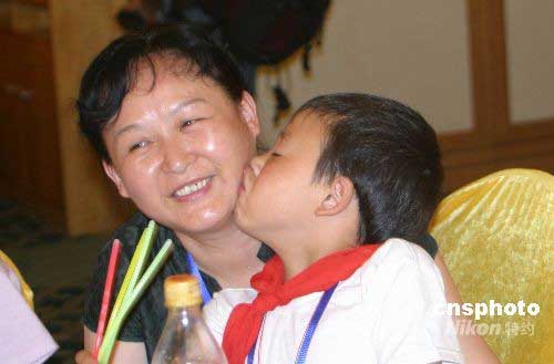 6月15日上午,參加“愛心呵護(hù)、陽光行動”活動的四川災(zāi)區(qū)孩子,在告別文藝演出現(xiàn)場深吻一直陪伴他們的心理學(xué)專家岳教授,表達(dá)內(nèi)心感恩。中新社發(fā) 付美斌 攝