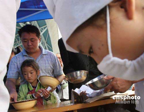 6月15日,四川汶川大地震災區(qū)民眾度過難忘的父親節(jié)。圖為北川縣受災的父女倆轉移到綿陽九州體育館避難,小姑娘陪著父親準備領取兩份免費的午餐。中新社發(fā) 賈國榮 攝