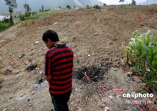 6月15日,四川汶川大地震災區(qū)民眾度過難忘的父親節(jié)。圖為映秀鎮(zhèn)一位幸存男孩來到此次地震遇難者千人公墓大土堆前,默默想念埋葬在這里的遇難父親和家人。中新社發(fā) 賈國榮 攝