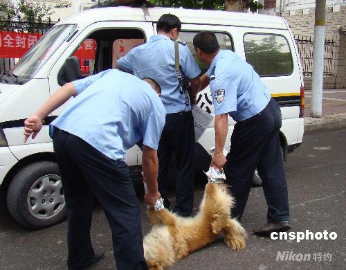 2008年6月16日中午,一條瘋狗闖進(jìn)河南省武陟縣城和平路縣直幼兒園附近并在圍墻邊游蕩,見人就咬,連續(xù)咬傷5名過往行人。此時(shí)已接近放學(xué)高峰,一旦咬傷學(xué)生后果不堪設(shè)想。武陟縣110接到群眾報(bào)警后,立即出動(dòng)4名警力攜帶微沖等捕殺工具趕至現(xiàn)場(chǎng),經(jīng)過20多分鐘追擊堵截,警察最終將瘋狗逼到一小胡同內(nèi),一名警察僅開一槍就將瘋狗打死。目前,被瘋狗咬傷的人員仍在醫(yī)院搶救。中新社發(fā) 雒根生 攝