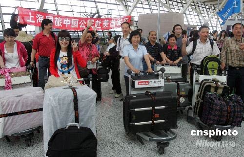 6月17日上午,上海赴美國旅游首發(fā)團(tuán)共79名游客分兩批從浦東國際機(jī)場出發(fā),開始為期10天的美國游。此次首發(fā)團(tuán)的10天行程游覽目的地主要涉及紐約、華盛頓、洛杉磯、費(fèi)城等美國東西海岸主要城市,自由女神像、第五大道、華爾街、好萊塢大道等經(jīng)典景點(diǎn),是首發(fā)團(tuán)的必游之地。中新社發(fā) 湯彥俊 攝