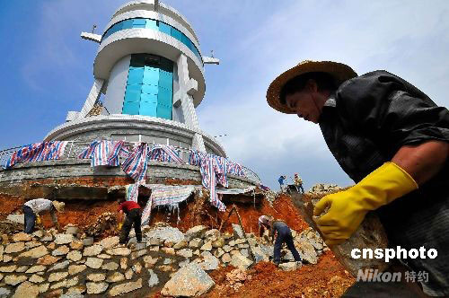 6月17日,廣西梧州工人在雷達(dá)塔地基處搶修承重?fù)跬翂Α_B日的大雨,使得位于梧州榜山頂上梧州氣象局新建的雷達(dá)塔地基發(fā)生小型坍塌,塔體地面出現(xiàn)裂紋。中新社發(fā) 何鎏 攝