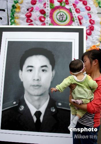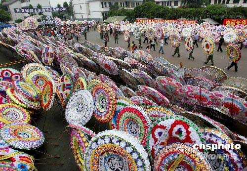 6月21日,在都江堰市胥家鎮(zhèn)抗震英雄武文斌烈士的靈堂前,各地群眾敬獻(xiàn)的花圈已達(dá)兩千余個,數(shù)千民眾自發(fā)來到抗震英雄武文斌烈士的靈堂前進(jìn)行悼念。26歲的濟(jì)南軍區(qū)“鐵軍”部隊(duì)炮兵指揮連二期士官武文斌,因連日救災(zāi)勞累,于6月18日4時45分犧牲。6月21日,濟(jì)南軍區(qū)某集團(tuán)軍作出決定,為犧牲在抗震救災(zāi)第一線的某紅軍師實(shí)習(xí)士官學(xué)員武文斌追記一等功,并批準(zhǔn)為烈士。中新社發(fā) 曾憲平 攝