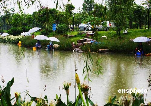2008年6月26日下午,風(fēng)雨飄搖,但廣東佛山市東平新城佛山公園內(nèi)依然有不少市民冒著風(fēng)雨在此悠閑垂釣。當(dāng)日,臺風(fēng)離開佛山,但雨水遲遲沒有離去。據(jù)廣東氣象臺預(yù)報(bào),未來三天,廣東全省大部將維持大到暴雨。中新社發(fā) 春添 攝