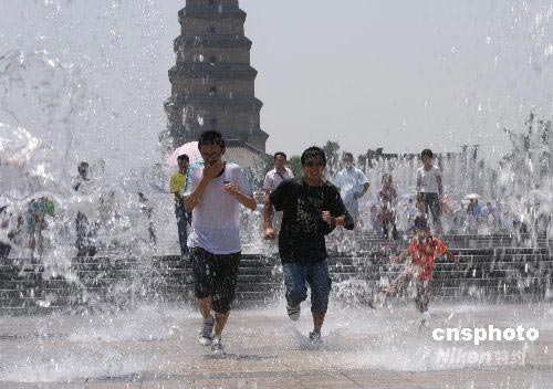 6月28日,西安當(dāng)日氣溫高達(dá)37攝氏度,市民們歡快地在大雁塔噴泉廣場上戲水降溫。中新社發(fā) 尤中原 攝