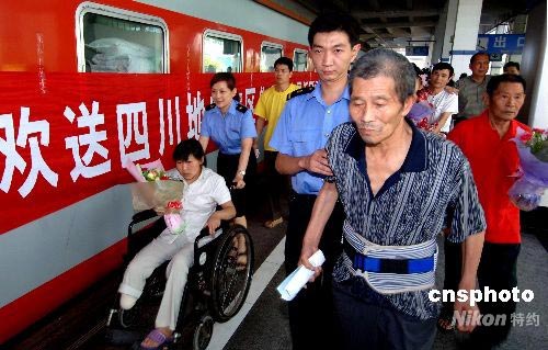 7月3日,在福建省立醫(yī)院、福建醫(yī)科大學(xué)附屬協(xié)和醫(yī)院、南京軍區(qū)福州總醫(yī)院等福州五家醫(yī)院接受治療的37名四川地震災(zāi)區(qū)傷員康復(fù)出院,由福州市民政部門工作人員護(hù)送至福州火車站,乘坐福州至成都列車踏上返鄉(xiāng)路。中新社發(fā) 劉可耕 攝