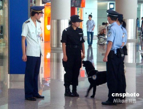 7月第一個(gè)周末,一位中國(guó)女特警牽著搜索犬到北京首都機(jī)場(chǎng)新大廳集結(jié)上崗,為保衛(wèi)北京奧運(yùn)會(huì)服務(wù)。中新社發(fā) 賈國(guó)榮 攝
