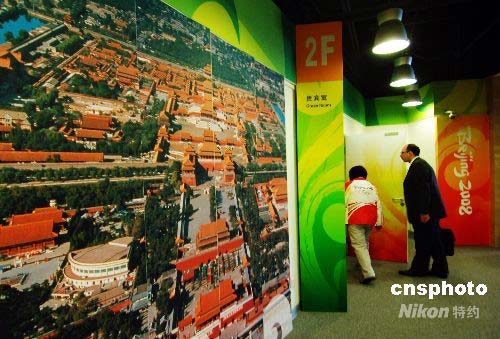 7月15日,一位外國(guó)友人走進(jìn)裝飾有大幅故宮鳥(niǎo)瞰圖的北京奧運(yùn)主新聞中心貴賓室。為展現(xiàn)中華五千年文化,北京奧運(yùn)主新聞中心充滿了中國(guó)元素。中新社發(fā) 王東明 攝